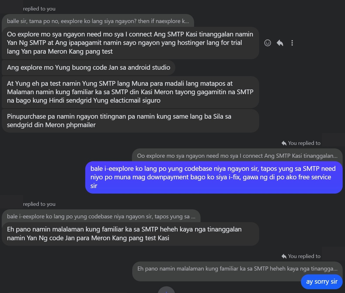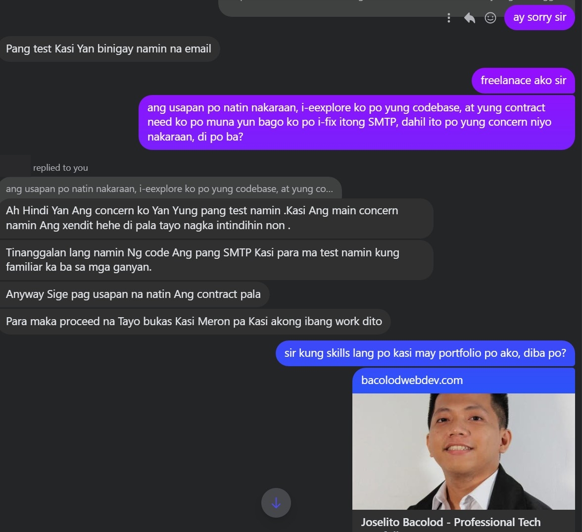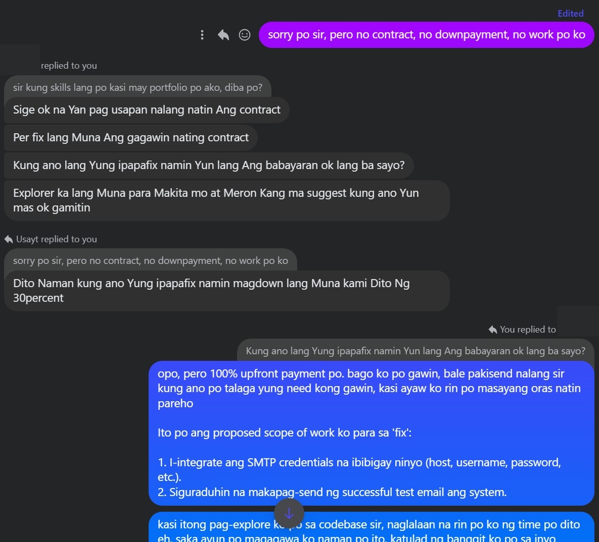 The final straw. When I sent a formal scope of work, they replied: "Tapos na namin nagawa ito." The very problem they hired me to fix didn't exist.